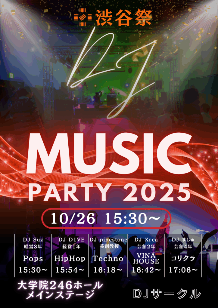 DJサークル5名によるD Jパフォーマンス! みんなの好きなあの歌も流れるかも!? 流れる曲は来てからのお楽しみ!!! ご来場お待ちしております! 場所 日本経済大学東京渋谷キャンパス大学院246ホールメインステージ 開演 2025年10月26日15:30〜 ⭐︎渋谷祭2025⭐︎ 開催日10月25日(土)・26日(日)会場日本経済大学東京渋谷キャンパス 入場無料(一部有料企画がございます。) ↓詳細はホームページをご確認ください。 https://shibuyafes.com